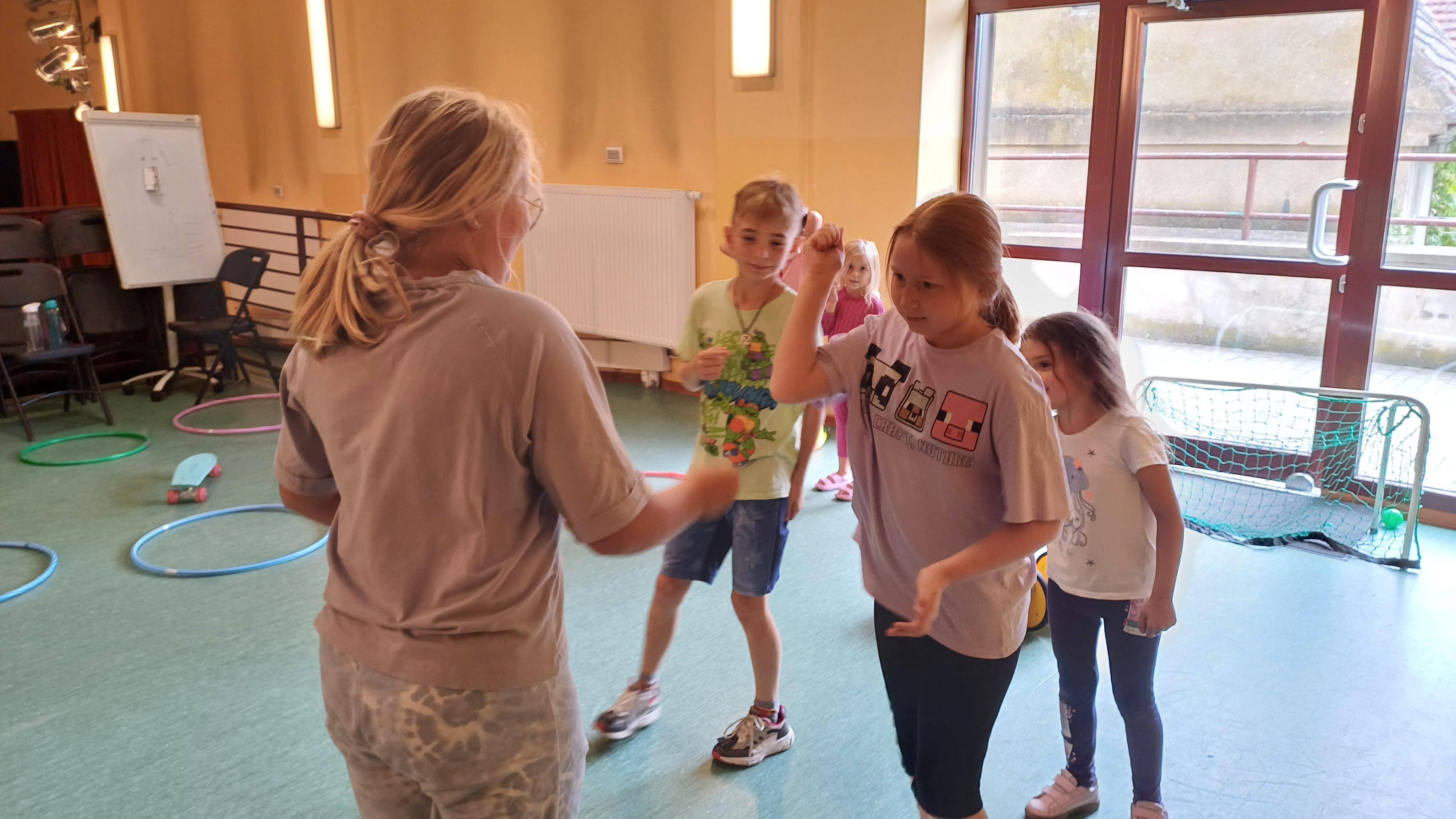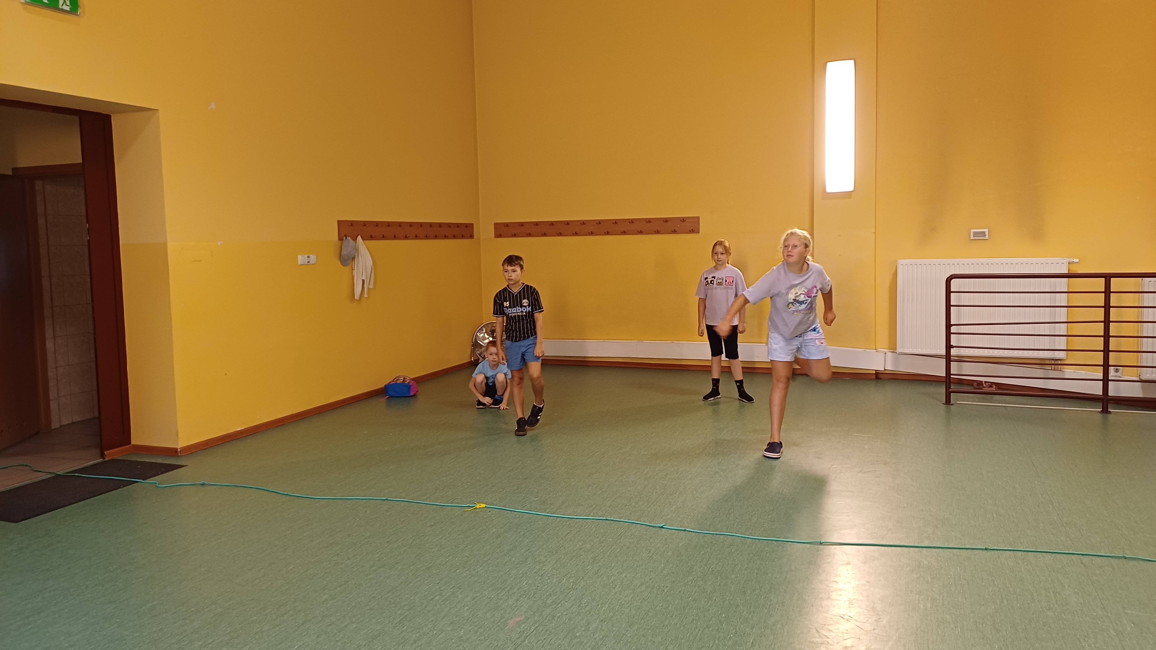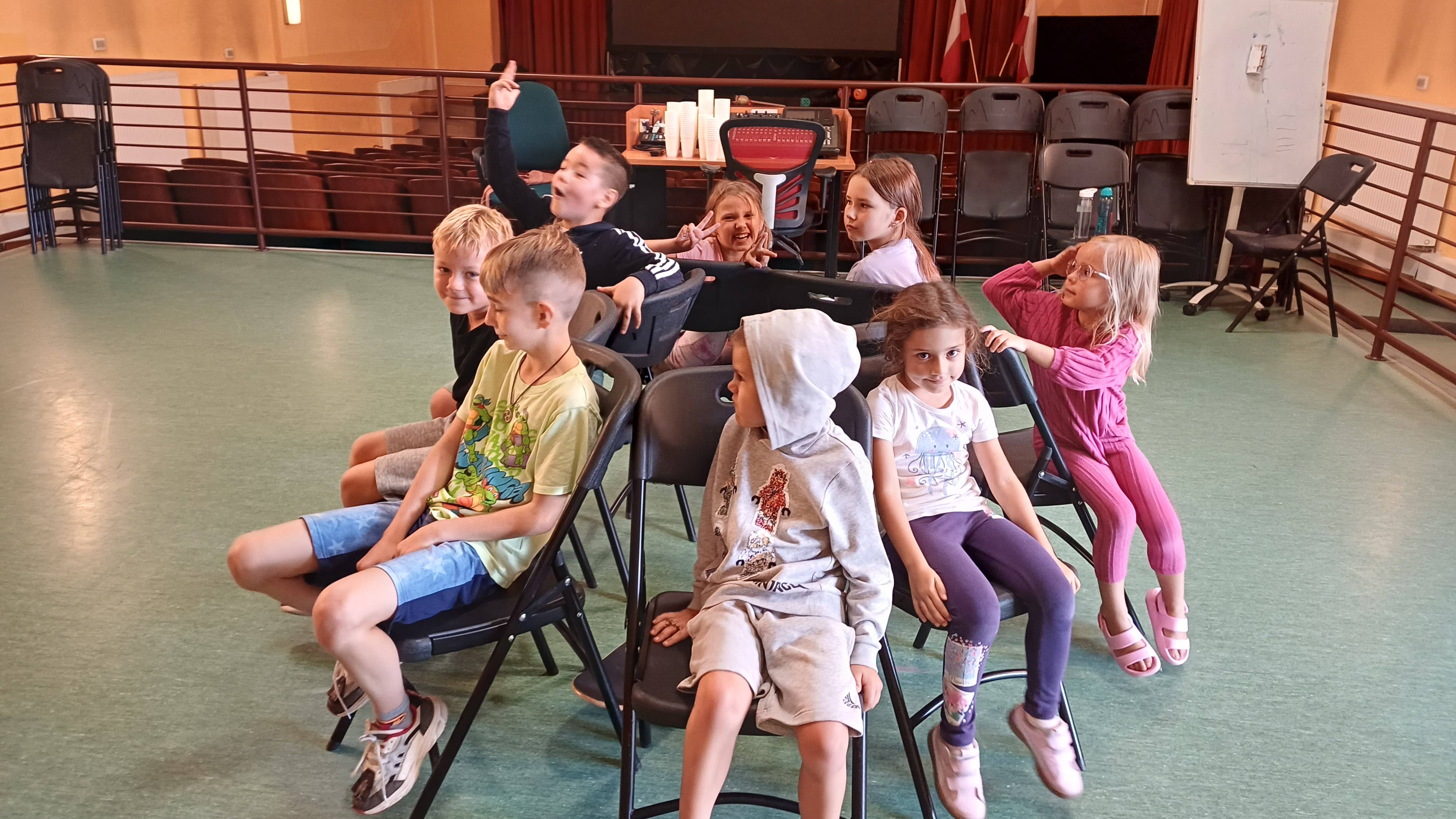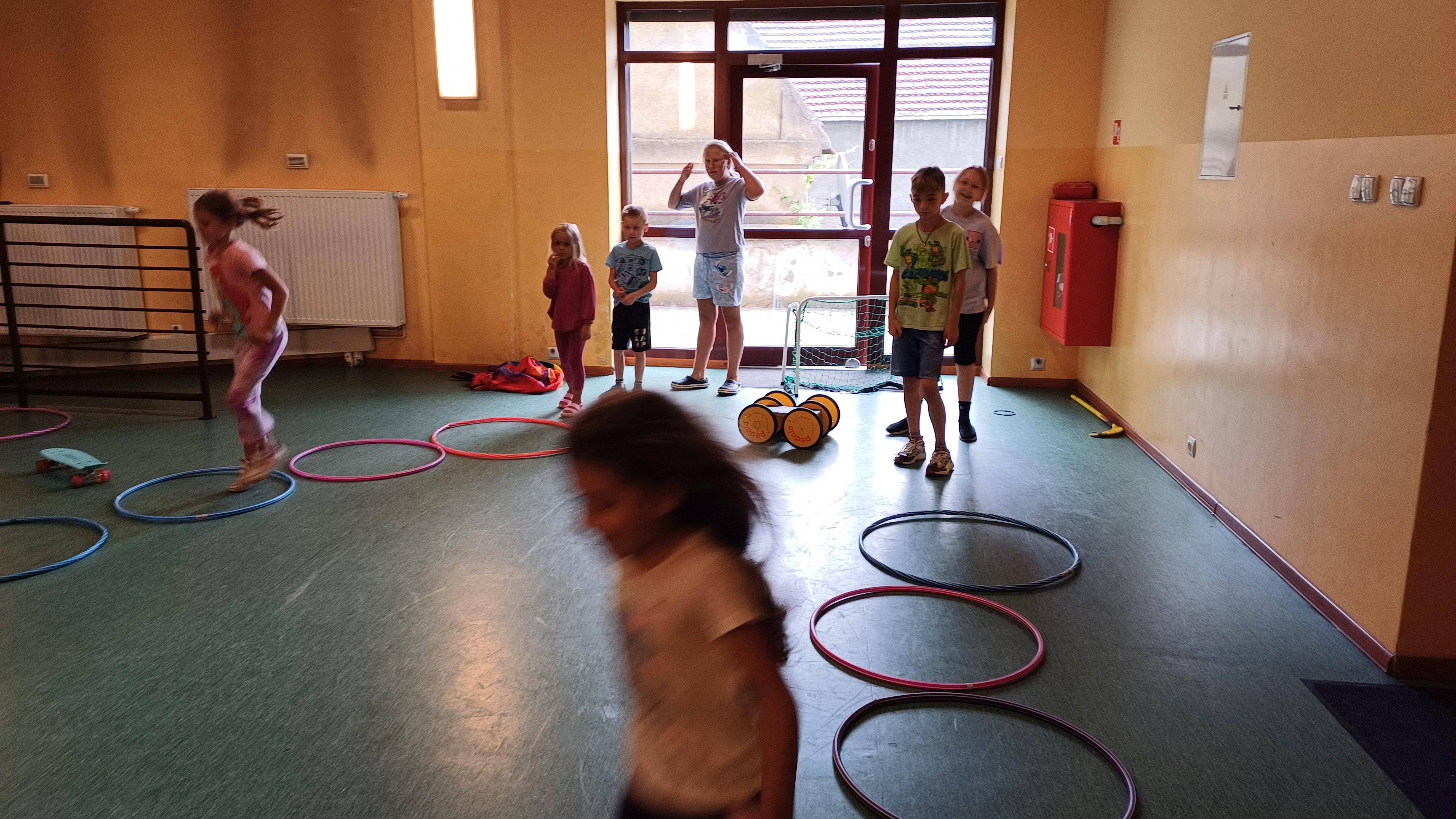 Podczas pełnych energii zajęć ruchowych wzięła udział liczna grupa dzieci w wieku od 5 do 11 lat. Starsi uczestnicy rywalizowali w takich grach jak zbijak czy bilard, natomiast młodsze dzieci świetnie bawiły się przy gorących krzesłach. Kulminacyjnym punktem zajęć była wspólna gra w chowanego, która zintegrowała wszystkie dzieci i dostarczyła mnóstwo radości – tym bardziej, że do dyspozycji miały cały parter budynku. Atmosfera była radosna, a dzieci chętnie angażowały się w każdą aktywność.