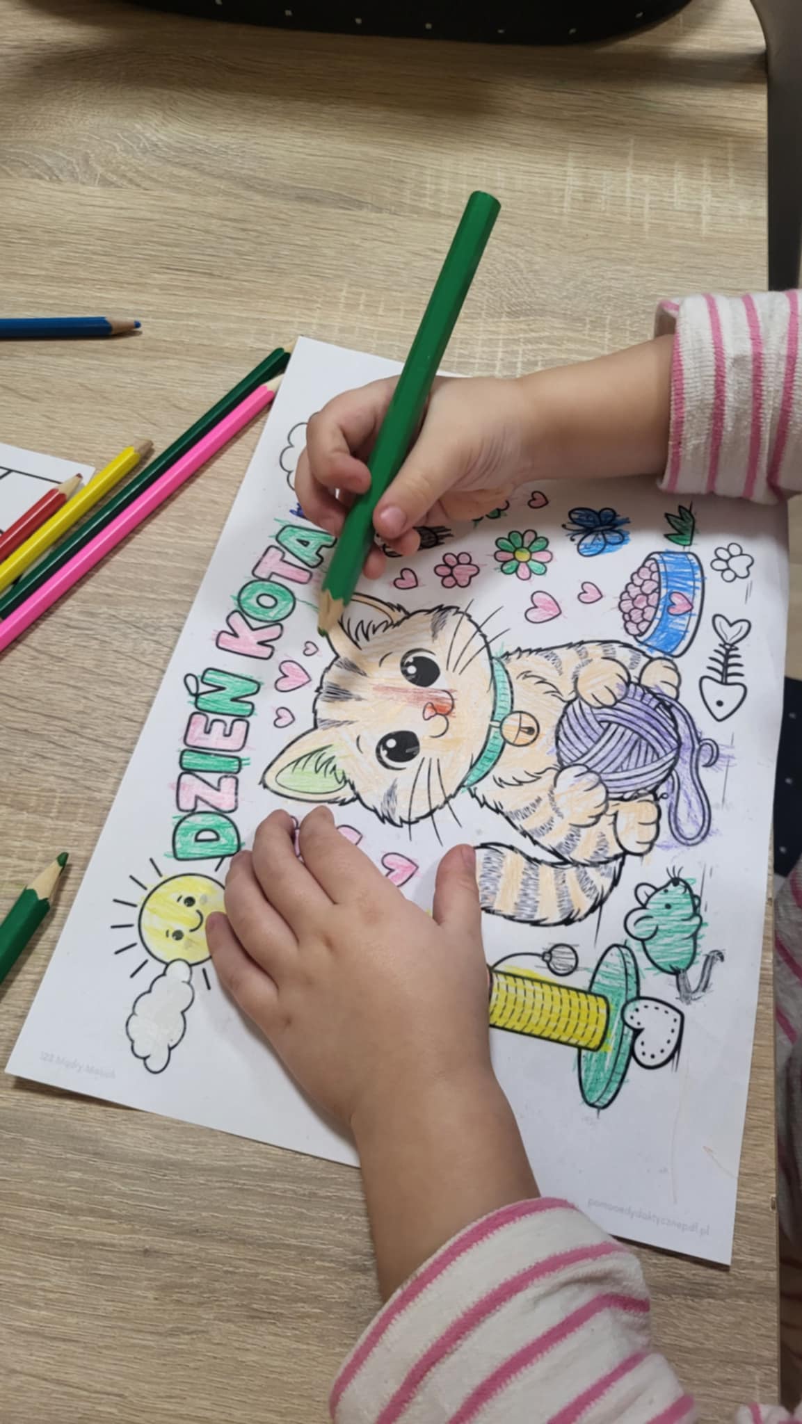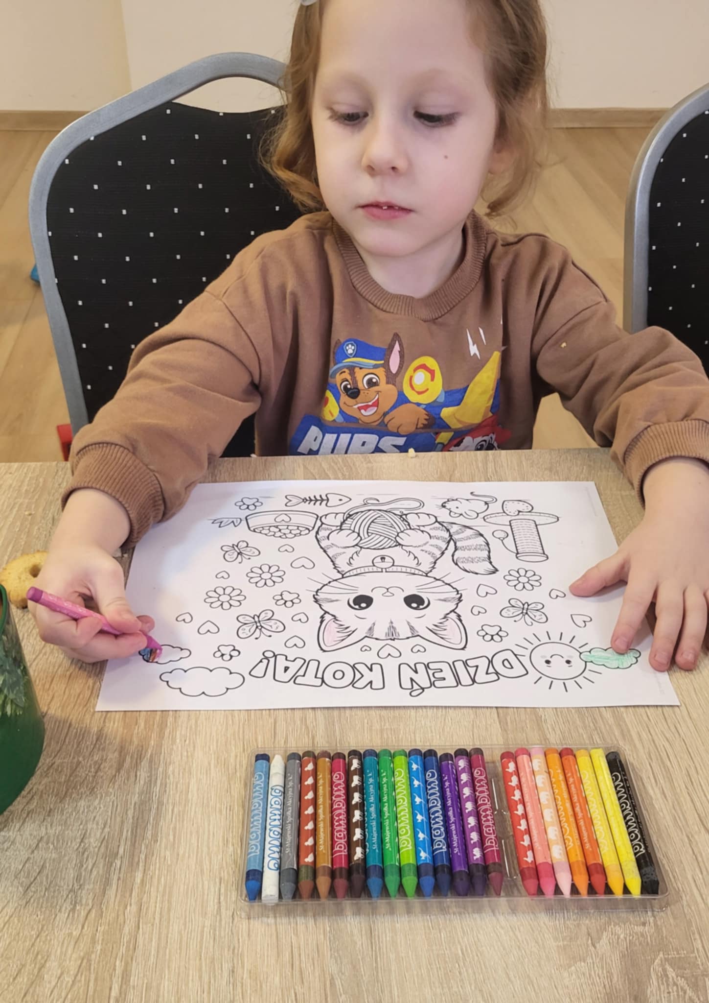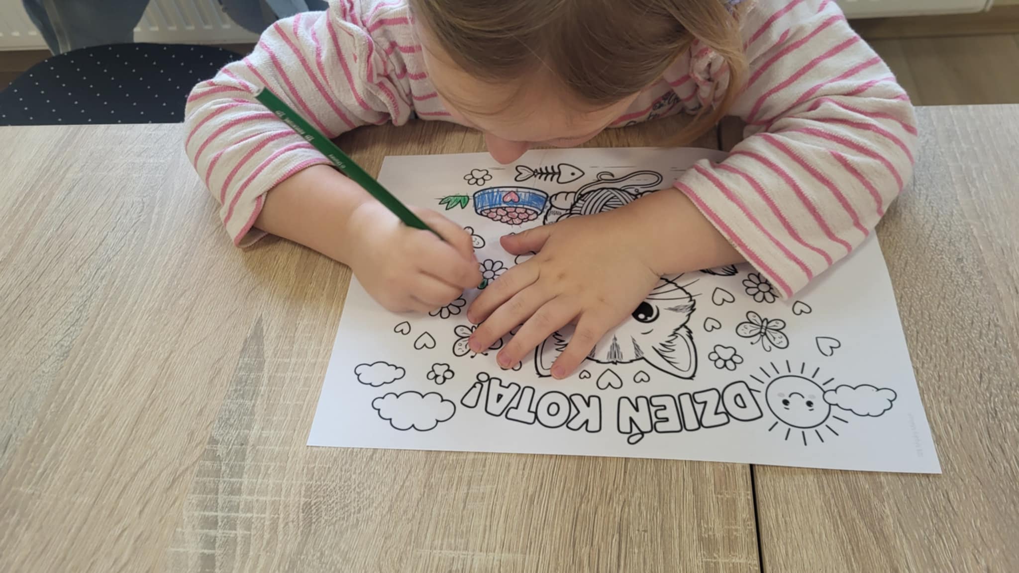 Z okazji Dnia Kota, dzieci z zaangażowaniem kolorowały ilustracje przedstawiające koty oraz rozmawiały o tym, jak należy dbać o zwierzęta.