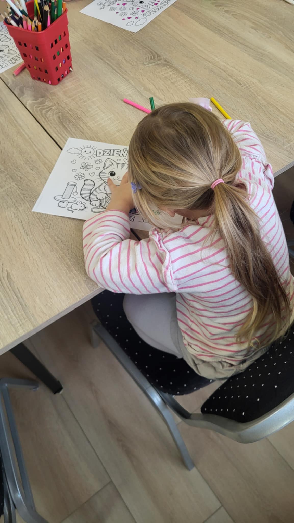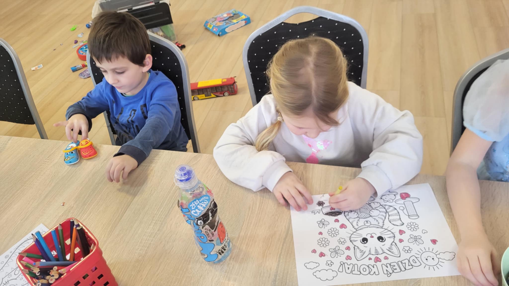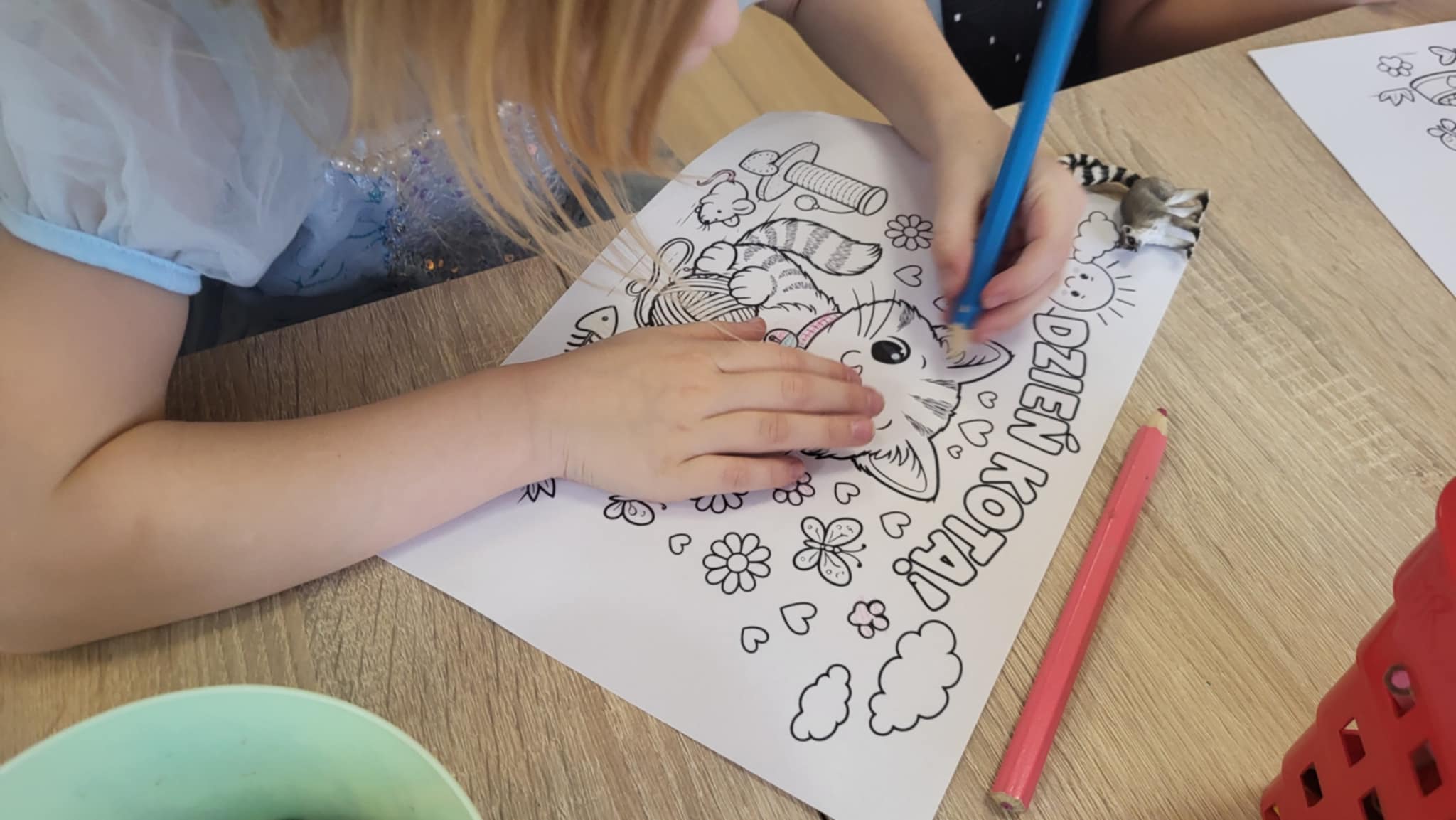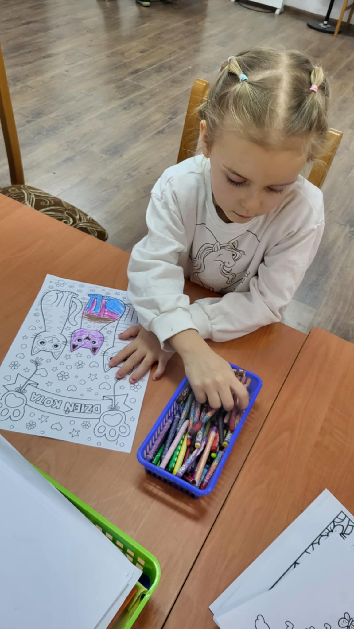 Z okazji Dnia Kota, dzieci z zaangażowaniem kolorowały ilustracje przedstawiające koty oraz rozmawiały o tym, jak należy dbać o zwierzęta.
