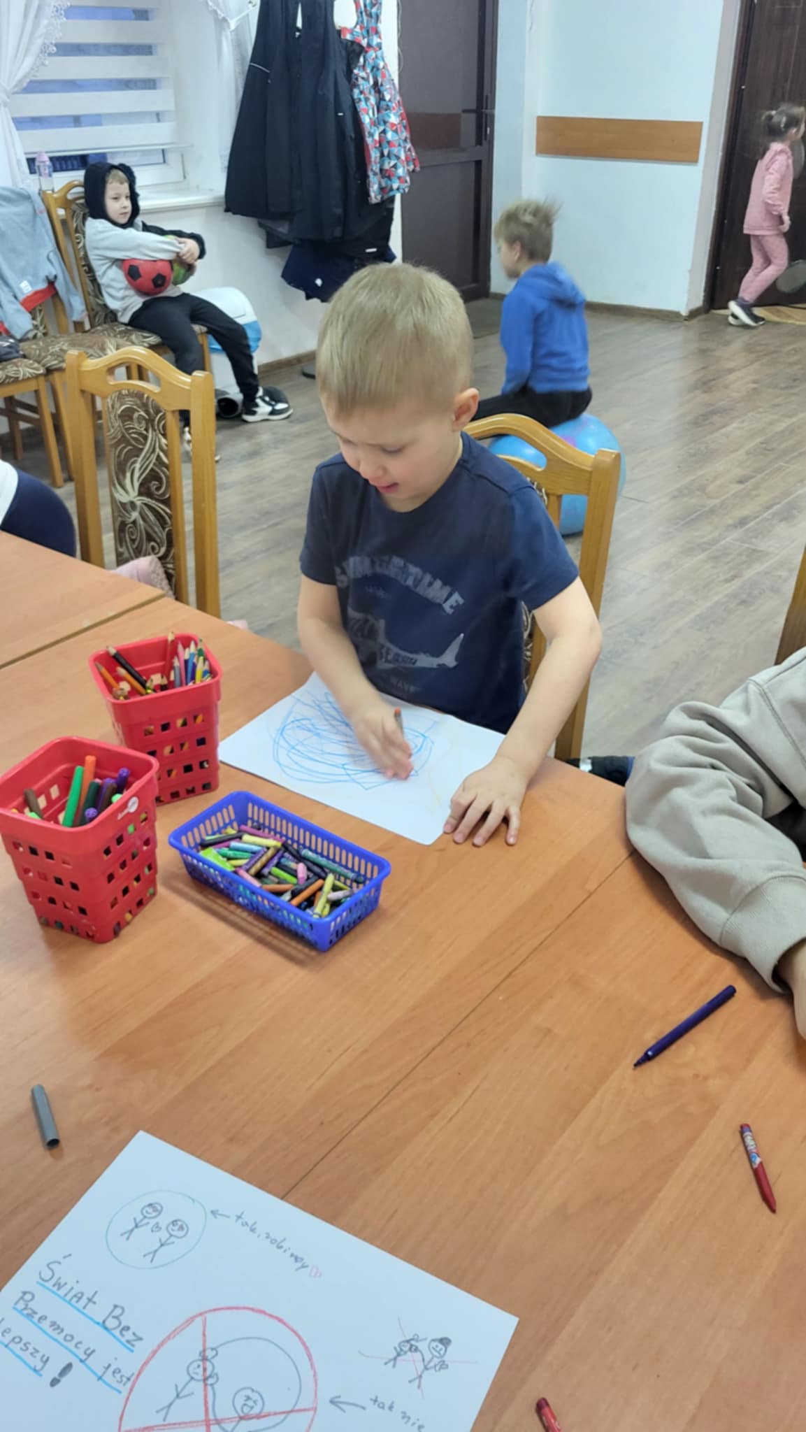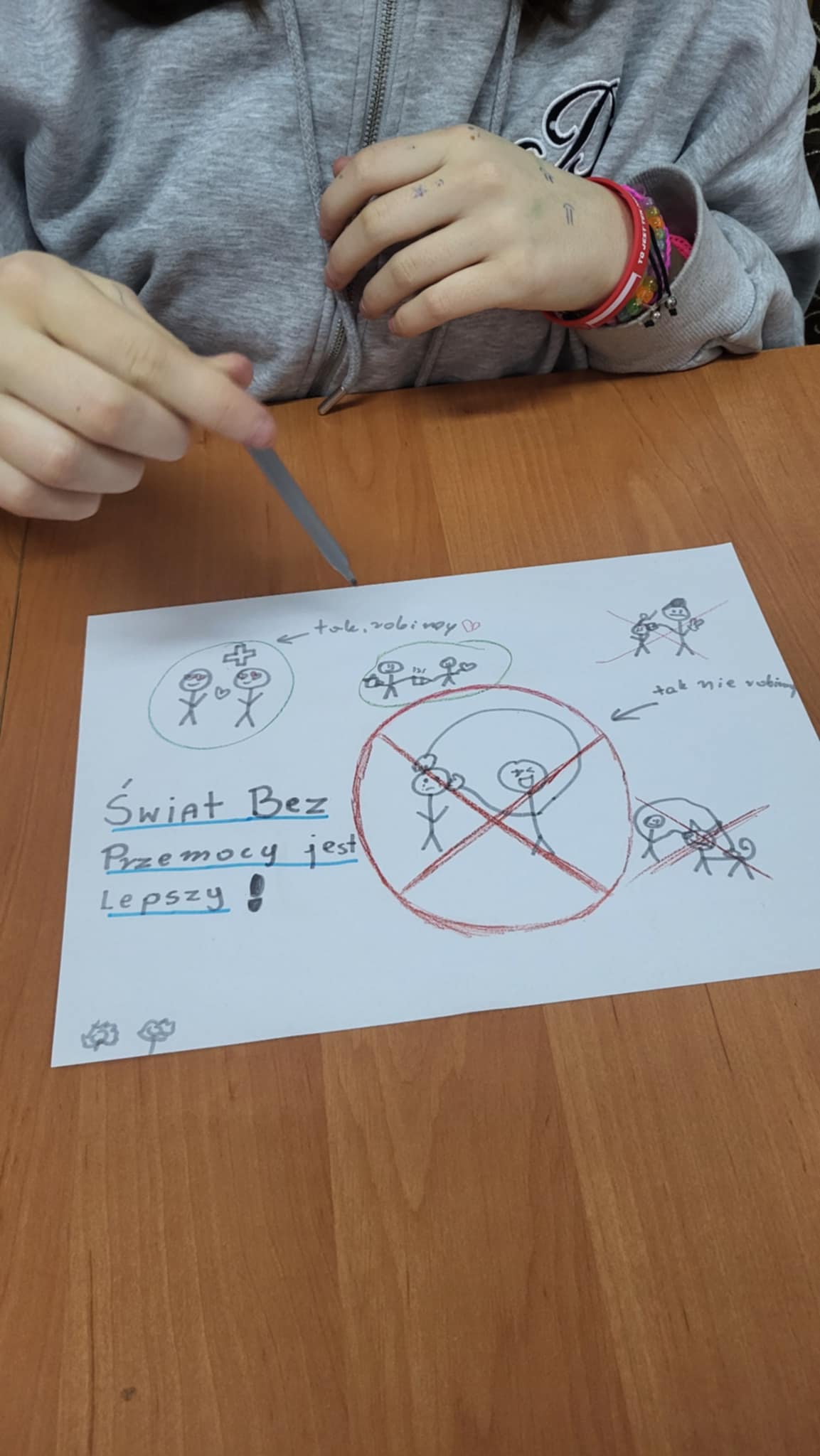 W ramach działań profilaktycznych wychowankowie przygotowywali plakaty dotyczące przeciwdziałania przemocy. Podczas zajęć poruszono temat szacunku, empatii oraz sposobów reagowania w trudnych sytuacjach.